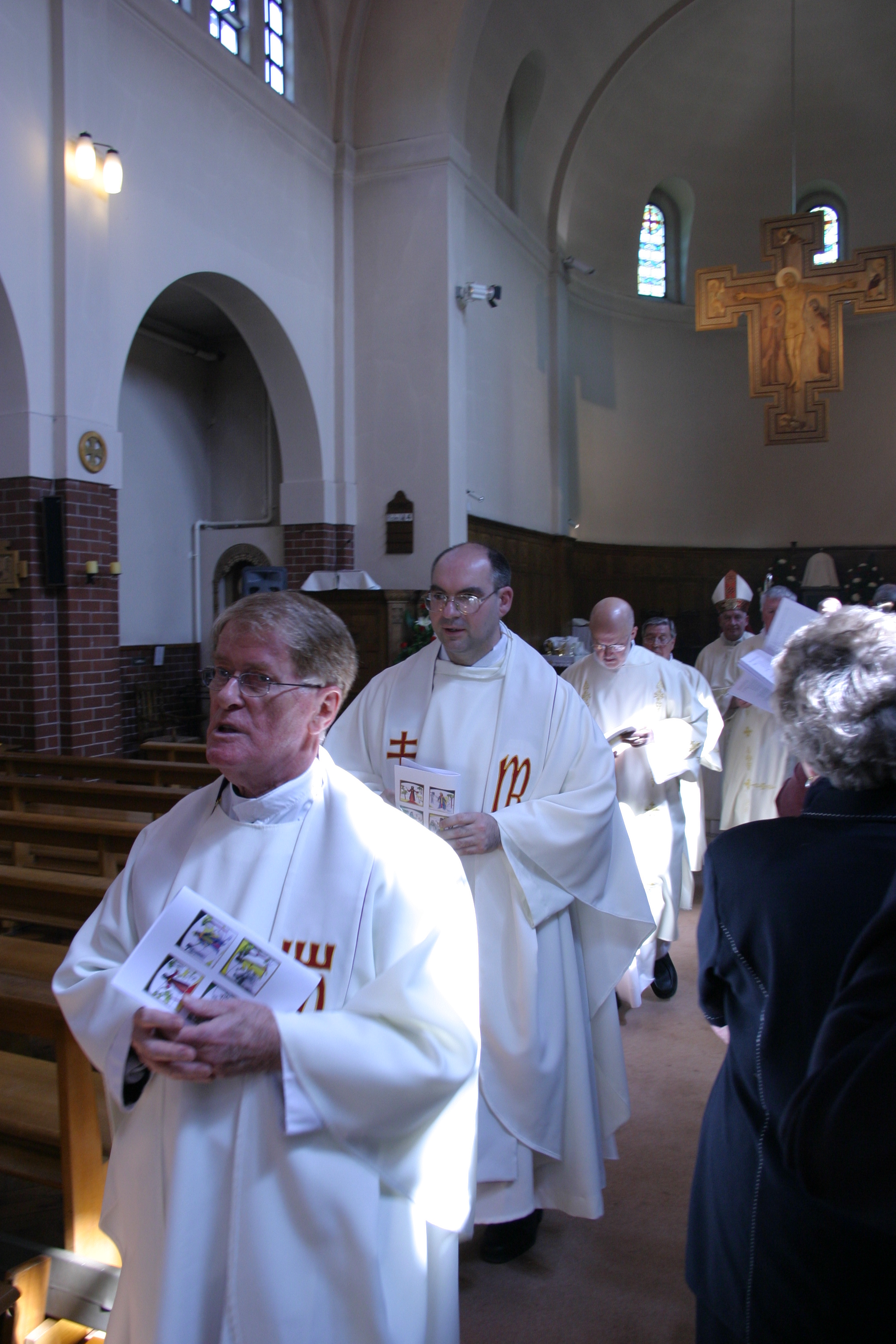 Fr Gareth joins the procession out of the church with the other priests, led by Fr Donal Gillespie who helped vest him in his new priestly vestments. |